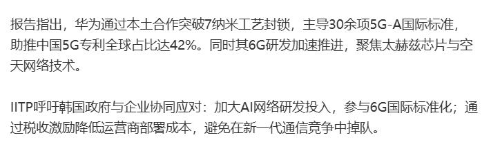 而韩国5G - A 的差距还没没补上,6G 再跟不上,可能就真要掉队了。IITP 紧急呼吁韩国积极应对:韩国若想在6G时代迎头赶上,政府、企业、科研机构等各方的协同合作刻不容缓。